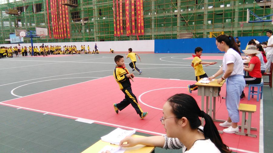 无独有偶,5月6日上午,三年级全体同学在各班数学科任老师的带领下,排着整齐的队伍,雄赳赳气昂昂来到大操场,举行了一场特殊的接力赛。各班均做到全员参与,只见12个班级的全体队员站在大操场50米迎面接力的起点,发令员一声令下,各班运动员箭一般的冲向终点,终点处语文老师早已准备了口算题和笔,正在等待孩子们的到来,当孩子们算好了口算题后,再拿着接力棒迅速跑回起点处,将接力棒传给下一名同学。体育老师们也在用秒表紧张地记录着每个班级的用时情况。激烈的接力比赛经过各班孩子的艰苦努力,很快在孩子们的欢呼声中结束,大家又在班主任老师的带领下,井然有序地回到教室。孩子们在这样的活动中,真切地感受到提高口算正确率和速度的必要性。“这是一次很有意义的活动,它将体育运动和数学口算训练很好的集合在了一起,激动,有趣!”体育组阮国耀老师在活动结束后高兴地说。